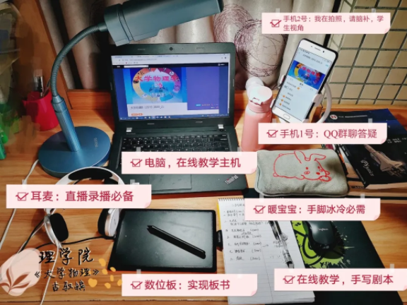 起初,我一直在思考,線上教學(xué)怎么開展?其實(shí)我不算個(gè)新手,2018年底,我在智慧樹錄制了《大學(xué)物理B》的慕課,但是整個(gè)過程中都有課程專員幫忙打理運(yùn)行細(xì)節(jié),自己親自上場(chǎng)構(gòu)建一門在線教學(xué)的經(jīng)驗(yàn)還是非常欠缺的。不過我認(rèn)為,使用何種線上技術(shù)手段是其次,最重要的是給學(xué)生營(yíng)造跟真實(shí)課堂相似的學(xué)習(xí)氛圍,確保將知識(shí)傳遞給學(xué)生。為了達(dá)到這個(gè)效果,我陸續(xù)購(gòu)置了數(shù)位板,直播耳麥等各種“直播神器”。