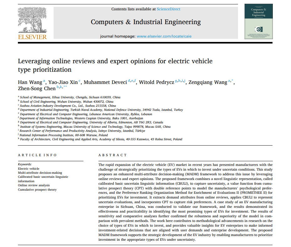 近日,管理學(xué)院非全日制研究生王涵在工程技術(shù)領(lǐng)域頂級期刊《Computers & Industrial Engineering》(中科院一區(qū)TOP期刊,影響因子6.7)上發(fā)表題為“Leveraging online reviews and expert opinions for electric vehicle type prioritization”的學(xué)術(shù)論文。該論文以西華大學(xué)為第一單位,王涵為第一作者,其指導(dǎo)教師王增強(qiáng)教授為通訊作者。
