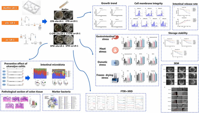 益生菌L. paraplantarum LR-1被三種不同的壁材料成功地包封以產(chǎn)生珠粒,這包括果膠鈣珠粒(CPB)、殼聚糖-果膠鈣珠粒(C-CPB)和藻酸鈉-果膠-乳清珠粒(SPW)。微囊化過程涉及兩種方法,包括直接包埋體外培養(yǎng)的生物膜細(xì)胞以制備CPB-ex-LR-1、C-CPB-ex-LR-1和SPW-ex-LR-1,以及在微膠囊內(nèi)培養(yǎng)LR-1以內(nèi)源形成生物膜,從而產(chǎn)生CPB-situ-LR-1、C-CPB-situ-LR-1和SPW-situ-LR-1。微膠囊的形態(tài)和含水量均符合質(zhì)量標(biāo)準(zhǔn)。外源型微膠囊表現(xiàn)出均勻分布的菌株,而內(nèi)源型微膠囊顯示細(xì)胞遷移到珠的邊緣。值得注意的是,CPB-situ-LR-1、C-CPB-situ-LR-1和SPW-situ-LR-1的細(xì)菌密度超過10 lg CFU/g。其中,SPW-situ-LR-1表現(xiàn)出更好的耐應(yīng)力性,在SGF和SIF中的釋放特性,以及在儲存期間的穩(wěn)定性。此外,SPW-situ-LR-1在緩解結(jié)腸炎炎癥方面顯示出與新鮮Biofilm-LR-1細(xì)胞一樣的結(jié)果,增加了UC小鼠腸道微生物群中乳酸桿菌的豐度。這些發(fā)現(xiàn)突出了微膠囊化技術(shù)在SA-PEC-WPI溶液中培養(yǎng)益生菌細(xì)胞以在微膠囊內(nèi)原位形成生物膜的益處。這項研究為下一代益生菌的開發(fā)提供了有價值的見解。