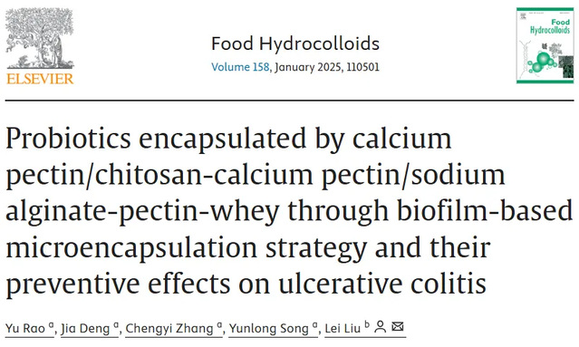 近日,我校食品與生物工程學(xué)院饒瑜教授團(tuán)隊與蘭州大學(xué)劉蕾青年研究員團(tuán)隊聯(lián)合在國際食品Top期刊《Food Hydrocolloids》(Q1,IF: 11.0)發(fā)表題為“Probiotics encapsulated by calcium pectin/chitosan-calcium pectin/sodium alginate-pectin-whey through biofilm-based microencapsulation strategy and their preventive effects on ulcerative colitis”的研究性論文。