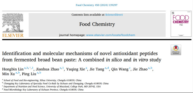 近日,我校食品與生物工程學院發酵調味品科學與工程課題組在食品領域國際Top期刊Food Chemistry發表題為“Identifying and molecular mechanisms of novel antioxidant peptides from fermented broad bean paste: A combined insilico and invitro study”的研究論文。食品與生物工程學院林洪斌副教授為第一作者。