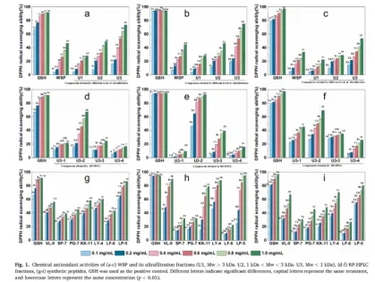 蠶豆是一種富含蛋白質的作物,在發酵過程中,大量微生物的劇烈代謝活動將食品基質中的蛋白質轉化為生物活性肽,包括抗氧化肽。在本研究中,最初使用超濾分離將WSP分成三個肽級分,測量每種組分的抗氧化性能。如圖1a-c所示,WSP的結果在0.1至1.0 mg/mL濃度范圍內呈劑量依賴性趨勢,并隨濃度增加而增加。在1.0mg/mL濃度下,DPPH、ABTS和OH-自由基的清除率分別為46.33±2.10%、44.22±0.96%和33.40±0.78%。經超濾分離后的U3自由基清除能力最強,表明隨著分子量的降低,其抗氧化活性逐漸增強。一般而言,分子量越小的肽表現出越強的抗氧化活性。此外,大多數抗氧化肽在其N-末端(即V、L)含有疏水氨基酸,而Pro、His、Tyr、Trp、Cys在序列中。疏水性氨基酸的脂肪族側鏈能夠促進抗氧化肽與多不飽和脂肪酸之間的相互作用,以及與自由基的結合。此外,這些疏水性氨基酸可能更容易暴露在低分子量肽中,有助于肽-脂質相互作用,從而增強自由基的穩定性。