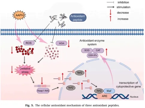 MDA由脂質過氧化作用產生,可與磷脂交聯并被蛋白質中存在的巰基氧化,其含量變化被用作生物體中氧化應激的重要指標,并間接表征由ROS引起的對細胞的氧化損傷的強度。如圖4(f)所示,與對照組(0.052 ± 0.020 nmol/mg蛋白)相比,AAPH誘導組的MDA含量(0.713 ± 0.026 nmol/mg蛋白)顯著增加(p < 0.001)。抗氧化肽LY-4、LP-5和VL-9預處理顯著降低了MDA的產生(p < 0.001)。同時,與AAPH誘導組相比,肽處理后細胞MDA水平的顯著降低與ROS的降低一致,以上結果表明,LY-4、LP-5和VL-9三種抗氧化肽均能抑制ROS誘導的脂質過氧化反應,從而保護AAPH誘導的HepG 2細胞氧化損傷。一些研究已經報道,抗氧化肽可以通過增強抗氧化酶(即CAT、SOD和GSH-Px)的活性并降低ROS和MDA含量來保護細胞免受氧化損傷在本研究中,基于分子對接和細胞實驗的結果,FBBP衍生的抗氧化肽(LY-4、LP-5和VL-9)的潛在作用機制總結于圖5中。