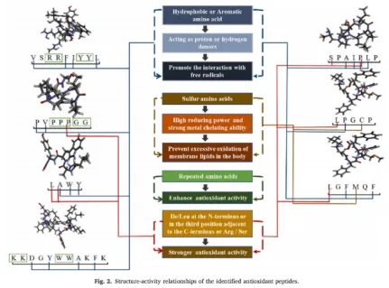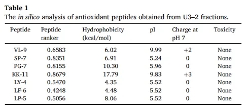 通過RP-HPLC將其分離為四個組分,各峰的抗氧化活性如圖1d-f所示。U3-2對DPPH、ABTS和OH-自由基的清除能力顯著高于其他3個組分(p < 0.05),在1.0mg/mL時,其清除率分別為67.03±0.27%、92.59±0.68%和69.25±2.76%。多肽的抗氧化能力還與芳香族氨基酸和含硫氨基酸的數量和位置有關,故收集了U3-2并用于隨后的肽序列分析。計算機模擬方法已廣泛應用于從食物衍生的蛋白質中發現新的生物活性肽,本研究采用UPLC-ESI-QTOF-MS/MS結合計算機模擬方法(包括Peptide Ranker、Toxin Pred、Pepdraw、Expasy compute pI/Mw分析和構效關系分析)對抗氧化活性最高的組分U3-2進行了鑒定。然而,目前關于抗氧化肽構效關系的研究還缺乏有效的信息。已報道含有芳香族或疏水性氨基酸的肽(Ile, Ala, Val, Phe, Asp, Tyr, Pro, Trp, Gly, Met and Leu)通過增強它們與脂質的相互作用或充當質子或氫供體來促進自由基清除活性。