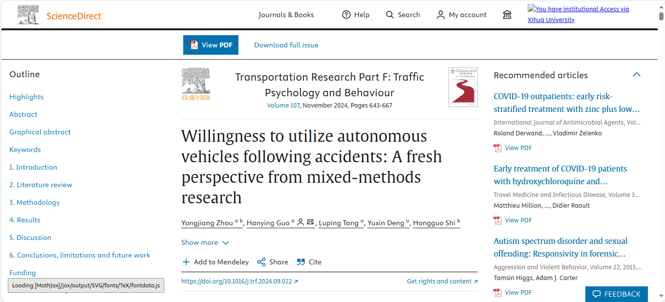 近日,汽車與交通學院智慧交通系統管控技術研究團隊在國際期刊《Transportation Research Part F:Traffic Psychology and Behaviour》(中科院2區,JCR1區)發表研究論文“Willingness to utilize autonomous vehicles following accidents:A fresh oerspective from mixed-methods research”,分享了團隊在交通行為和心理領域的新成果。