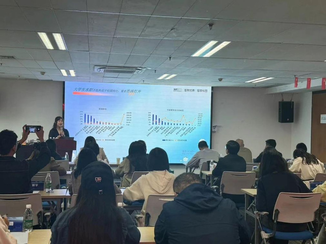 招生與就業處副處長李紹軍代表所有參訓學員作開班致辭之后,智聯招聘全國渠道負責人、校園及國際業務事業部執行總監徐晨以智聯招聘校招大數據為基礎,為學員分享高校畢業生就業趨勢。