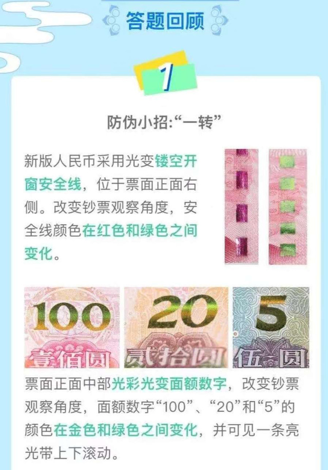 此次知識競賽從九月初正式啟動,歷時一個月。至九月底,校內共三百余人參賽。本次競賽流程為,參賽選手使用手機掃描二維碼觀看時長為三分鐘的第五套人民幣防偽知識,根據(jù)所學知識自主答題,待回答全部問題,學習完畢所有知識點,即可認為參賽成績有效,參賽結束。生動的動畫短片摒棄了傳統(tǒng)知識普及枯燥的宣傳形式,用通俗易懂的語言、生動的事例向大學生普及反假幣知識,使之在充滿趣味的氛圍中了解、掌握與生活息息相關的知識。