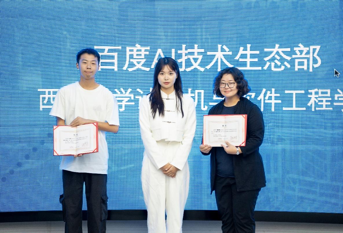 在活動現場,百度AI技術生態西南區域高級產品運營段喜萍為人工智能領航團團長、2023級智能科學與技術專業向陽同學及指導教師魏冬梅頒發了聘書,標志著領航團正式成立。
