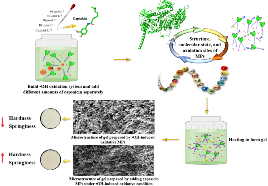 辣椒是川渝肉制品中常見的輔料,常用來增香和增添辛辣味。辣椒素作為辣椒中辣椒素類物質(zhì)的主要活性成分,其含量的多少是評(píng)價(jià)辣椒品質(zhì)的標(biāo)準(zhǔn)之一。辣椒素是一種無色、無味的化合物,其在食用時(shí)具有刺激性,可在人類口腔中產(chǎn)生灼燒感。辣椒素不僅可以增強(qiáng)食欲和促進(jìn)消化,還具有抗炎、殺菌和抗腫瘤的作用。近些年來,研究者們還對(duì)體內(nèi)辣椒素的受體、離子通道的激活以及促進(jìn)神經(jīng)肽的釋放等方面進(jìn)行了深入探究。由此可見,辣椒素在食品和醫(yī)藥領(lǐng)域具有很好的應(yīng)用前景。近年來,申請(qǐng)人和其他研究者發(fā)現(xiàn)辣椒素能與肉中肌原纖維蛋白之間產(chǎn)生良好的相互作用,但是有關(guān)氧化條件下辣椒素對(duì)肌原纖維蛋白分子狀態(tài)及成膠性能調(diào)控的系統(tǒng)性探究鮮有報(bào)道。本研究旨在從分子水平了解辣椒素在?OH誘導(dǎo)的氧化條件下如何影響肌原纖維蛋白的微觀結(jié)構(gòu)和凝膠特性。