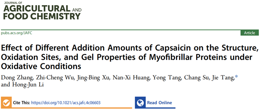 近期,川渝共建特色食品重慶市重點(diǎn)實(shí)驗(yàn)室、食品與生物工程學(xué)院唐潔教授團(tuán)隊(duì)在《Journal of Agricultural and Food Chemistry》(農(nóng)業(yè)與食品化學(xué)雜志1區(qū),IF= 5.7)發(fā)表了題為“Effect of Different Addition Amounts of Capsaicin on the Structure, Oxidation Sites, and Gel Properties of Myofibrillar Proteins under Oxidative Conditions”的研究性論文。唐潔教授為論文的通訊作者,張東副教授為論文的第一作者。該研究得到四川省自然科學(xué)基金科教聯(lián)合面上項(xiàng)目(2024NSFSC2081,辣椒素調(diào)控肌原纖維蛋白氧化穩(wěn)定性及自組裝成膠行為機(jī)制研究)、四川省科技計(jì)劃重點(diǎn)研發(fā)項(xiàng)目(23ZDYF3100, 基于分子動(dòng)態(tài)調(diào)控技術(shù)提升油炸肉類預(yù)制菜品質(zhì)的研究與應(yīng)用示范)和重慶市科技局技術(shù)創(chuàng)新與應(yīng)用發(fā)展專項(xiàng)重點(diǎn)項(xiàng)目(CSTB2023TIAD-KPX0029, 預(yù)制菜冷殺菌保鮮保質(zhì)裝備研發(fā)與應(yīng)用)的支持和資助。
