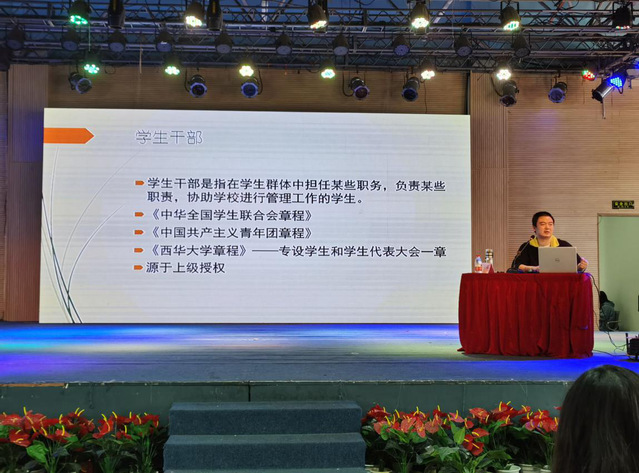 接著,易宇峰老師以“學生干部的擔當”為主題進行授課,他指明何為學生干部、學生干部應當做什么、遵循什么樣的干部原則。易宇峰老師強調學生干部作為學校和廣大學生之間的橋梁,應當有個人擔當,在信仰的傳承中詮釋初心的意義,在奮斗中綻放生命的光芒,是各位學生干部的重要目標。他鼓勵學生干部應當在奮斗中永遠銘記擔當精神,并且應當在學習和工作中以相應的規定和章程來嚴格要求自己。