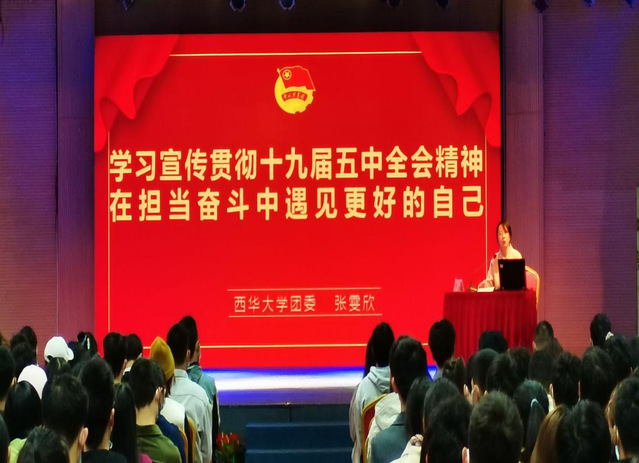 為深入貫徹學習第十九屆五中全會精神,明確團委學生工作者的奮斗目標和責任,培養學生團學干部積極意識,11月7日,西華大學團委在學生活動中心三樓舉辦“做新時代主動擔當作為的奮斗者”專題培訓班。本次培訓班邀請到西南交通大學力學與工程學院黨委副書記孔祥彬老師、我校團委副書記張雯欣老師、經濟學院黨委副書記易宇峰老師和團委陳錦老師擔任主講人。