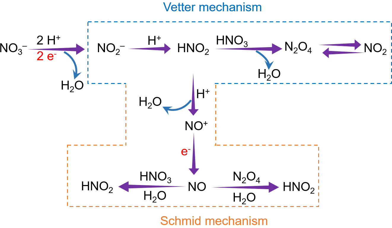 在強酸性環境下,當NO3?濃度在1.0 ~ 4.0 M范圍內時,還原過程通常通過兩種間接自催化還原途徑進行:Vetter機制和Schmid機制。