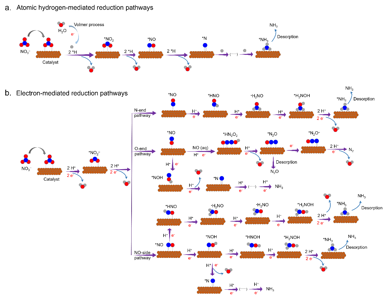當NO3?的濃度小于1 M時,還原過程通常通過兩種直接電催化途徑進行:(a) 原子氫介導的還原途徑和(b)電子介導的還原途徑。