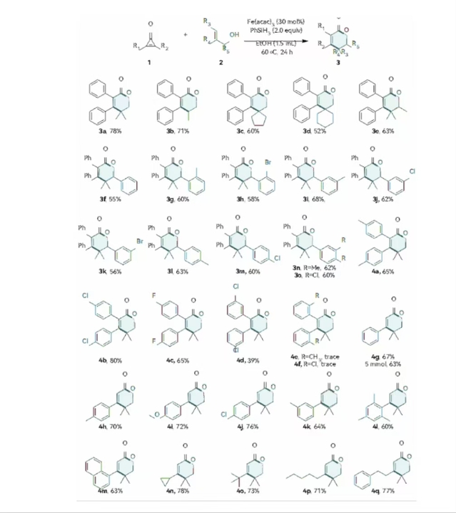 該反應表現出良好的底物普適性。各種環狀烯丙醇和具有不同取代基的烯丙醇,包括甲基、鹵素、芳環,以中等到優異的收率下得到目標化合物。反應也兼容不同的環丙烯酮,各種取代的二苯基環丙烯酮、單邊苯基環丙烯酮、單邊烷基環丙烯酮順利生成了不同的吡喃酮分子。同時,當反應底物變為烯烴時,各種不同取代基的烯烴,如苯基、烷基或環烷基,反應均能順利發生,以中等到良好的收率得到茚酮化合物。