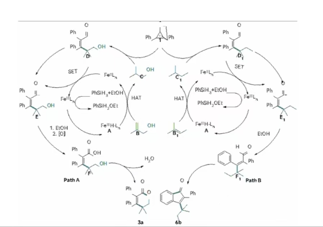 綜上所述,作者開發了一種Fe(III)催化的環丙烯酮和受體烯烴的自由基擴環策略,構建了一系列新型的2H-吡喃酮和完全取代的1-茚酮。作者還提出了可能的機理:氫原子轉移形成烷基自由基,自由基打開環丙烯酮的三元環,生成中間體。中間體有兩條反應途徑:當烯烴的β位有一個羥基時,反應生成2H-吡喃酮,否則生成1-茚酮。該方法具有反應條件溫和、底物適應性廣、原料便宜易得等優點。