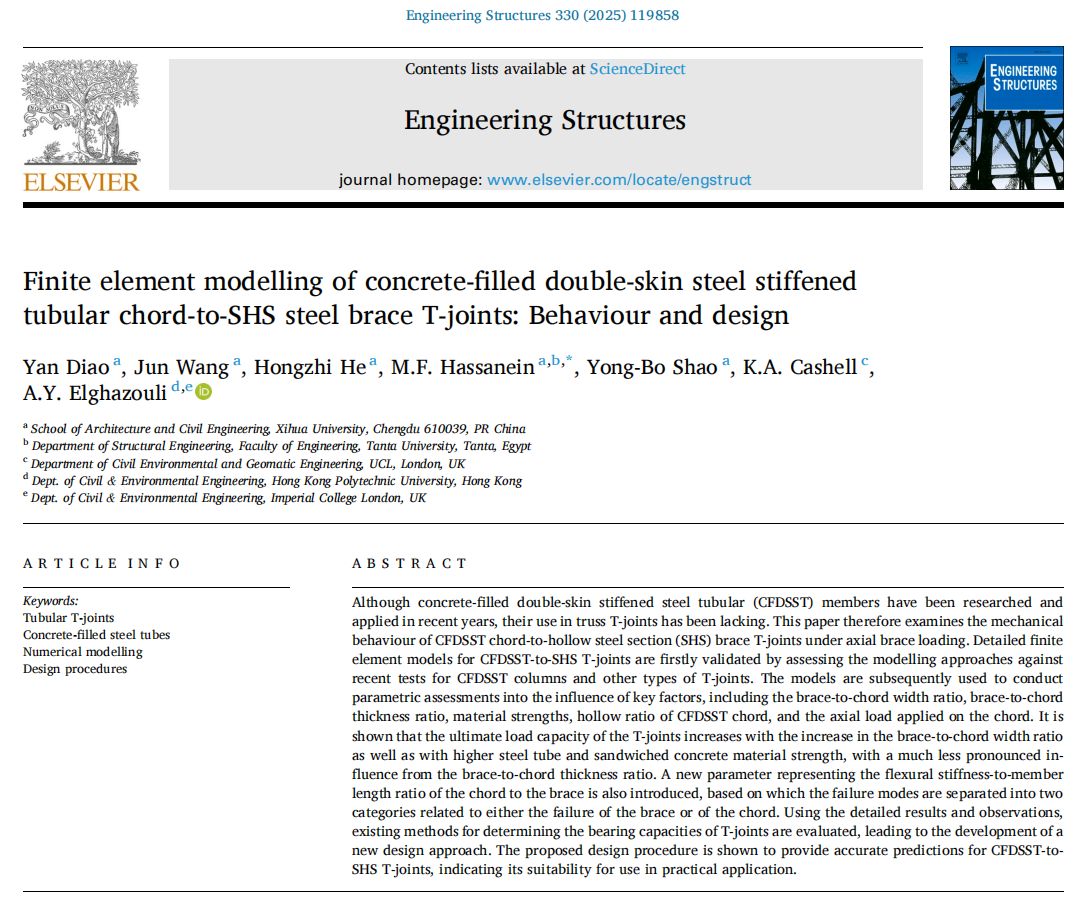 論文《Finite element modelling of concrete-filled double-skin steel stiffened tubular chord-to-SHS steel brace T-joints: Behaviour and design》以西華大學為第一單位,刁硯教授為第一作者,建筑與土木工程學院外籍教師哈桑尼教授為通訊作者,西華大學的邵永波教授、倫敦大學學院的K.A.Cashell教授,帝國理工大學的A.Y.Elghazouli教授參與了該論文的工作。論文主要研究了中空夾層帶肋鋼管混凝土T形節點的力學性能。鋼管混凝土作為一種廣泛運用于建筑和橋梁工程中的受力結構,研究其結構形式的新穎性和受力的合理性對于工程實踐有重要意義。