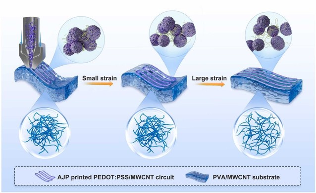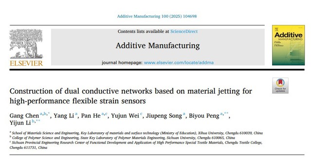 近日,材料科學與工程學院彭必友教授團隊在增材制造領域頂級期刊Additive Manufacturing(中科院1區TOP,IF=10.3)在線發表了題為“Construction of dual conductive networks based on material jetting for high-performance flexible strain sensors”的研究論文。材料學院陳剛副教授為第一作者兼通訊作者,2022級碩士研究生李洋為該論文的第二作者,彭必友教授和四川大學李怡俊副研究員為共同通訊作者,西華大學為論文第一單位。研究工作得到了國家自然科學基金、有機無機復合材料國家重點實驗室開放課題、四川大學與中國核動力研究院院校聯合基金等項目的支持。