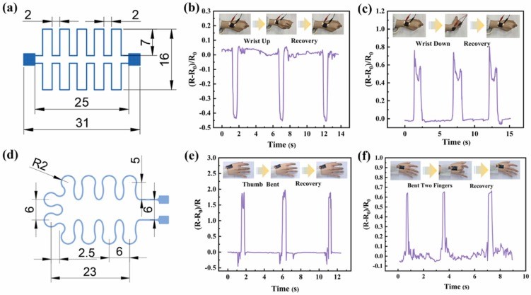 隨著智能穿戴設備和物聯網技術的快速發展,柔性應變傳感器在健康監測、人工智能及機器人等領域展現出廣闊的應用前景。提升柔性傳感器的靈敏度、應變響應范圍和可靠性一直是實際應用中亟待解決的問題。通過對傳感器導電網絡進行圖案化構筑,不僅可有效放大對微應變的響應,還能優化應力分布,顯著提升傳感器整體性能。據此,彭必友教授團隊利用氣溶膠噴射打印技術(AJP)非接觸、高精度及寬材料適應性的優勢,制備了一種具有雙導電網絡結構的柔性應變傳感器,并實現了導電網絡結構的多種圖案化形態與尺寸調控。所制備的典型蜿蜒形傳感器展現了0.6–80%的應變響應范圍和高達31.2的GF靈敏度。此外,傳感器在經歷2000次循環加載后,仍能穩定輸出信號,具有良好的循環穩定性。進一步的,借助AJP技術的圖案化優勢,研究團隊制備了不同網格密度的應變傳感器。結果表明,靈敏度與網格密度呈非線性關系,在2×6網格配置下,傳感器的GF最高可達47.52,突出了圖案化設計的優勢。基于AJP打印的應變傳感器在人體運動監測、摩爾斯編碼通信及UAV飛行狀態監測等應用場景中表現出色。該研究不僅成功實現了在柔性襯底表面構建圖案化的導電網絡結構,還為其它柔性電子器件的設計與構筑提供了新思路。