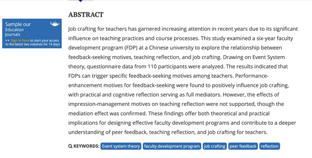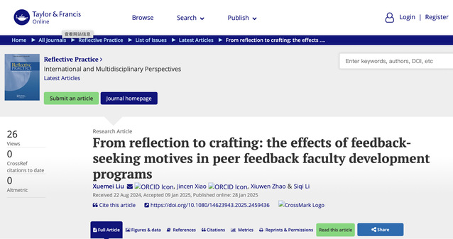 近日,管理學(xué)院數(shù)智化人力資源管理研究團(tuán)隊(duì)在教育學(xué)和教學(xué)研究領(lǐng)域SSCI二區(qū)期刊《Reflective Practice》(IF=1.6)發(fā)表重要研究成果,研究論文題目為“From reflection to crafting: the effects of feedback-seeking motives in peer feedback faculty development programs”。