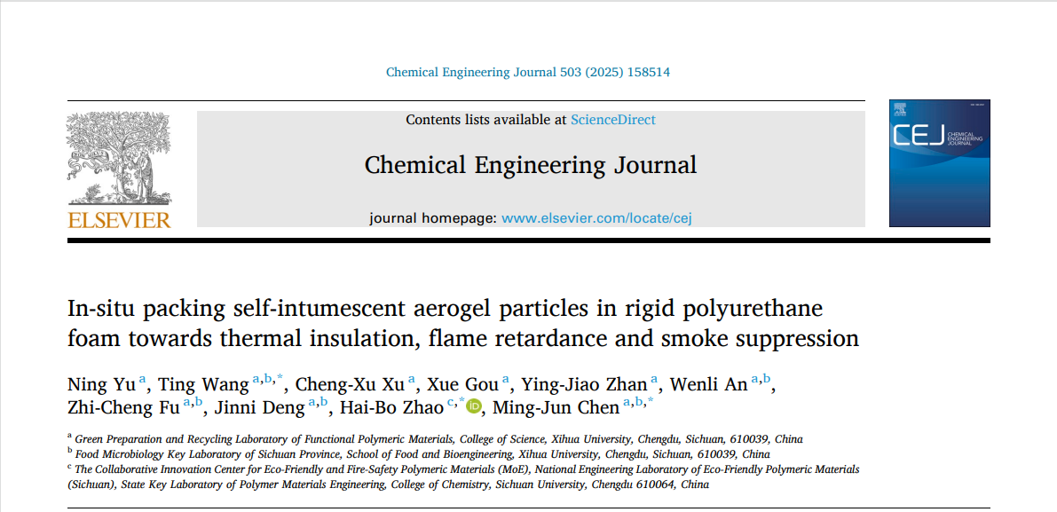 近日,理學院功能高分子材料綠色制備與循環(huán)利用研究團隊在阻燃保溫復合材料研究上取得新進展。相關成果發(fā)表在材料領域著名刊物Chemical Engineering Journal(中科院1區(qū)TOP,IF: 13.4),第一作者為理學院2025屆材料科學與工程專業(yè)碩士研究生余寧,通訊作者為汪婷副教授、陳明軍教授,以及四川大學趙海波教授,西華大學為該論文的第一完成單位。