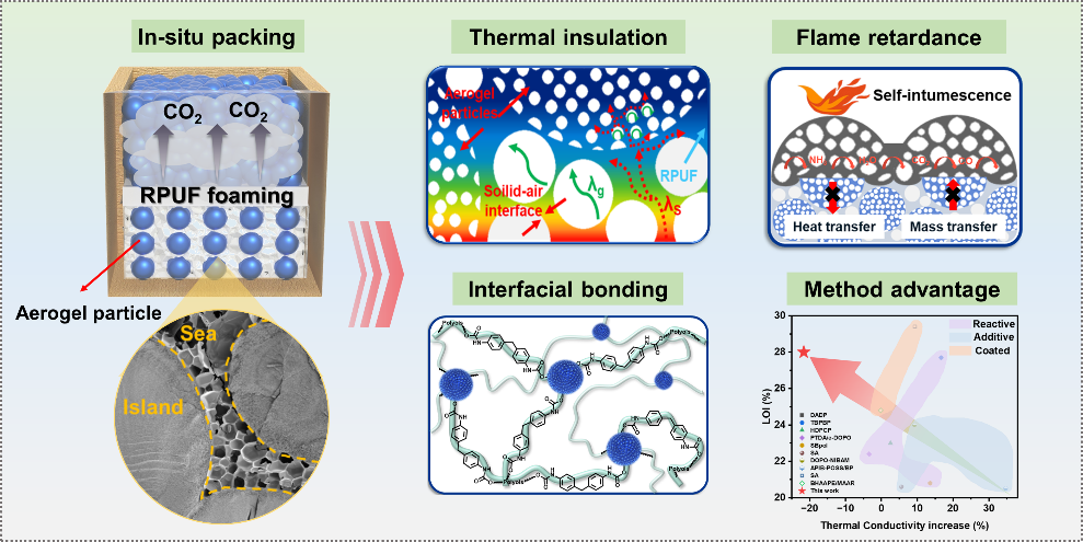針對這一難題,本課題組提出了一種新穎、簡單的界面鍵合和原位填充策略,將自膨脹的生物質(zhì)氣凝膠膠粒引入RPUF。構(gòu)筑獨特“海-島”孔結(jié)構(gòu)以創(chuàng)建復雜的導熱路徑和增強的界面熱阻,成功解決了阻燃性能與保溫性能的矛盾問題。向RPUF中引入氣凝膠膠粒可以將導熱系數(shù)從36.5 mW/m·K降低到28.6 mW/m·K,保溫性能提升約21.6%。此外,氣凝膠/RPUF復合材料表現(xiàn)出優(yōu)異的阻燃性能,極限氧指數(shù)(LOI)顯著提升至28%,峰值放熱率(- 38.0%)和產(chǎn)煙率(- 54.0%)顯著降低,表現(xiàn)出優(yōu)異的火安全性。不僅如此,氣凝膠/RPUF復合材料的抗壓強度顯著提高(+ 93.7%),與同領域工作相比,該工作的火安全性能和隔熱保溫性能等均具有突出優(yōu)勢。因此,該工作為制備具有高阻燃效率和優(yōu)異保溫性能的RPUF復合材料提供了新的思路。