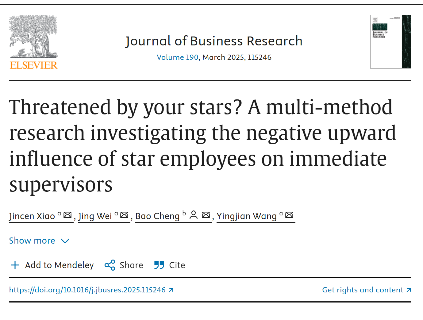 近日,西華大學管理學院肖金岑副教授課題組在管理學領域國際一流期刊Journal of Business Research發表題為“Threatened by your stars? A multi-method research investigating the negative upward influence of star employees on immediate supervisors”的學術論文。肖金岑副教授是文章第一作者,管理學院研究生韋靜、王英健分別為文章第二、第四作者。