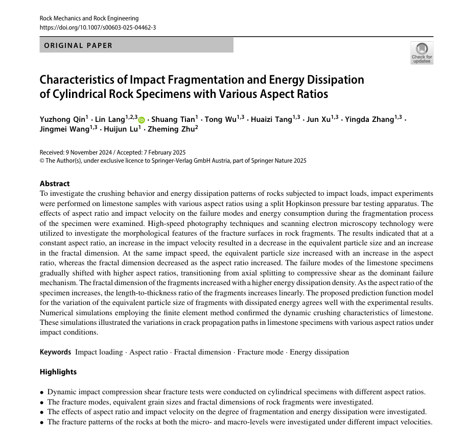 近日,由建筑與土木工程學(xué)院力學(xué)教學(xué)部郎林副教授指導(dǎo)的2022級(jí)土木工程碩士研究生秦煜中以第一作者在巖石力學(xué)領(lǐng)域國(guó)際TOP期刊Rock Mechanics and Rock Engineering(中科院二區(qū)Top,IF=5.5)上發(fā)表題目為“Characteristics of Impact Fragmentation and Energy Dissipation of Cylindrical Rock Specimens with Various Aspect Ratios”的研究論文。郎林副教授和四川大學(xué)朱哲明教授為共同通訊作者,西華大學(xué)為論文第一單位和通訊單位。