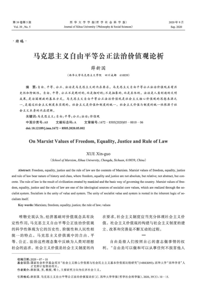 4.近日,《中國(guó)社會(huì)科學(xué)文摘》2021年第2期以《社會(huì)主義核心價(jià)值觀論析》為題,轉(zhuǎn)載了我校馬克思主義學(xué)院薛新國(guó)教授在《西華大學(xué)學(xué)報(bào)(哲學(xué)社會(huì)科學(xué)版)》2020年第5期發(fā)表的文章《馬克思主義自由平等公正法治價(jià)值觀論析》。
