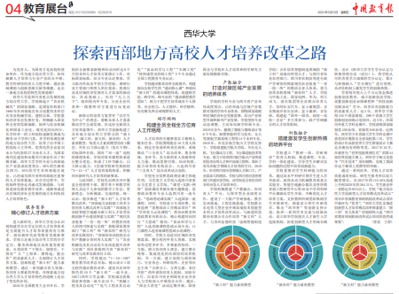 2.3月5日,《中國教育報(bào)》以“西華大學(xué):探索西部地方高校人才培養(yǎng)改革之路”為題,深入報(bào)道我校面向新時(shí)代高等教育發(fā)展新要求,精心修訂人才培養(yǎng)方案,構(gòu)建全員全程全方位育人工作格局,打造對接區(qū)域產(chǎn)業(yè)發(fā)展的培養(yǎng)體系,搭建激發(fā)學(xué)生創(chuàng)新熱情的培養(yǎng)平臺所開展的系列工作和取得的成績。