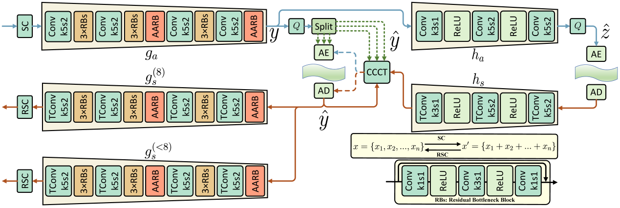 GLIC模型框架通過Reconstruction Split and Concat(SC/RSC)模塊,將任意通道數圖像轉換為二維矩陣處理,解碼時還原原始格式。模型核心由分析器、合成器以及超先驗分析器和超先驗合成器構成,用于優化編碼效率。CCCT模塊通過均勻分組潛在表示、優先處理信息量較大塊,解決多通道圖像信息冗余問題,加速編解碼并保證預覽圖像質量。AARB模塊融合注意力機制與殘差網絡優勢,自適應識別語義信息重要性,提升壓縮效率的同時保證圖像高保真度。