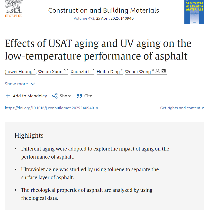 近日,由建筑與土木工程學院王文奇副教授指導的2023級土木工程碩士研究生黃嘉偉以第一作者身份,在建筑與建材領域國際TOP期刊《Construction and Building Materials》(一區Top,IF=7.4)發表題為“Effects of USAT aging and UV aging on the low-temperature performance of asphalt”的研究論文。王文奇副教授為通訊作者,論文以西華大學為第一單位和通訊單位。