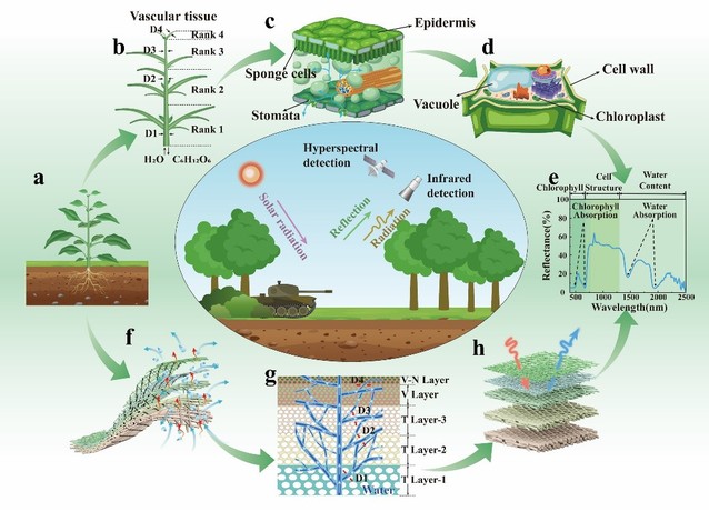 在仿生學的啟發下,袁樂教授團隊采用靜電紡絲技術構建了類天然葉片的多級分層網絡結構,實現了可見光、熱紅外及高光譜波段的全天候、寬頻、智能偽裝。該靜電紡絲織物具備在水分驅動下的黃-綠可逆變色能力,可自適應模擬天然樹葉在不同生長階段的色彩變化;通過多層纖維間的光譜耦合效應,該材料的反射光譜曲線與綠色樹葉高度相似,使其具備卓越的高光譜偽裝性能,可使多種經典的高光譜分類算法誤將其識別為天然樹葉;此外,精心設計的梯度孔隙多層結構具有優異的單向導水性能,有效模擬了植物的蒸騰散熱效應,蒸騰速率是傳統綠色偽裝織物的四倍,即使在炎熱的夏季,其紅外輻射溫度與天然葉片的最大差異也僅為1.01℃。本研究為開發寬譜、高性能的智能偽裝材料提供了一種新穎策略,該策略在偽裝遮障器材、單兵偽裝服飾,以及個人熱調節材料領域具有廣闊的應用前景。