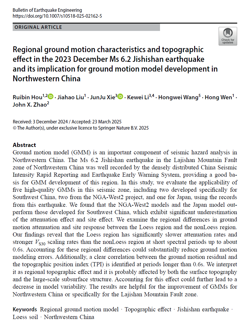 近日,建筑與土木工程學(xué)院道路與橋梁工程系青年教師侯瑞彬在歐洲地震工程協(xié)會官方出版期刊《Bulletin of Earthquake Engineering》(中科院二區(qū),IF=4.1)發(fā)表學(xué)術(shù)論文。論文題目為“Regional ground motion characteristics and topographic effect in the 2023 December Ms 6.2 Jishishan earthquake and its implication for ground motion model development in Northwestern China”,西華大學(xué)為第一單位,侯瑞彬老師為第一作者,我校2022級本科生劉家豪為第二作者,中國地震局地球物理研究所謝俊舉研究員為通訊作者。