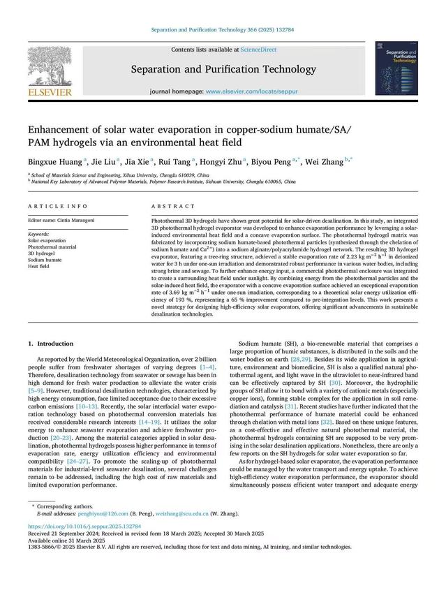 近日,材料科學與工程學院彭必友教授團隊在國際TOP期刊《Separation and Purification Technology》(IF=8.2)發表題為“Enhancement of solar water evaporation in copper-sodium humate/SA/ PAM hydrogels via an environmental heat field”的文章。西華大學為論文第一通訊單位,黃冰雪博士為第一作者,西華大學彭必友教授和四川大學張偉教授為共同通訊作者。