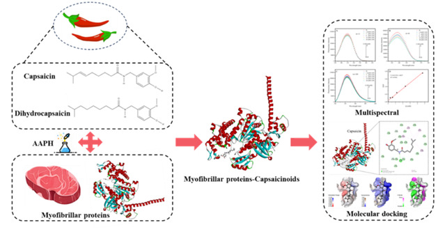 近年來,預(yù)制食品市場在全世界范圍內(nèi)顯著擴(kuò)張,特別是在中國這樣的發(fā)展中國家,消費者對便利性以及健康和可持續(xù)的預(yù)制產(chǎn)品的要求越來越高。魚肉、豬肉、牛肉和家禽等是主要的預(yù)制肉類制品,它們在食用前需要冷藏和再加熱。近年來,消費者對零售冷藏預(yù)制肉制品的需求激增,然而,關(guān)鍵的限制因素仍然存在,例如肉制品在儲存過程中的蛋白質(zhì)氧化敏感性,導(dǎo)致產(chǎn)品變質(zhì),這影響了產(chǎn)品的感官屬性和營養(yǎng)完整性。因此,探索現(xiàn)代預(yù)制加工技術(shù)對產(chǎn)品穩(wěn)定性的影響,特別是對于預(yù)制肉制品,由于其蛋白質(zhì)含量高,確保儲存期間的產(chǎn)品質(zhì)量是一個更復(fù)雜的挑戰(zhàn)。辣味作為人們?nèi)粘o嬍持胁豢苫蛉钡摹翱谖丁保钍芟M者的喜愛。辣椒素(CAPs)是辣椒中主要的辛辣物質(zhì)。CAPs是一類包含在辣椒果實中的生物堿,是賦予辣椒辛辣風(fēng)味的主要成分,主要由辣椒素(CAP)和二氫辣椒素(DCAP)單體組成,約占辣椒素的91%。在中國的西南地區(qū),湖南省和江西省等地,由于CAPs的存在,辛辣味經(jīng)常與肉類風(fēng)味一起被發(fā)現(xiàn),以增強(qiáng)產(chǎn)品的風(fēng)味并延長食品的貨架期。牛肉是預(yù)制肉制品的重要來源,是一種高蛋白、低脂肪、低膽固醇、營養(yǎng)豐富的肉類,其蛋白質(zhì)的氨基酸組成接近人體所需,深受消費者的喜愛。肌肉蛋白質(zhì)是牛肉中最重要的功能性成分之一,賦予牛肉產(chǎn)品許多重要的理化性質(zhì)和感官品質(zhì)。肌肉蛋白質(zhì)占整個肌肉重量的15- 22%,肌原纖維蛋白(MP)占肌肉蛋白質(zhì)的55- 60%,是形成肌肉纖維的結(jié)構(gòu)蛋白質(zhì)。MP參與活生物體的肌肉收縮過程,并調(diào)節(jié)牛肉和牛肉制品的保水、凝膠化和乳化等特性,從而直接影響產(chǎn)品的嫩度和質(zhì)地。因此,控制牛肉預(yù)制肉制品中MP的氧化仍是一個需要克服的挑戰(zhàn)。盡管大量研究證實了CAPs在醫(yī)藥和食品領(lǐng)域中具有抗氧化、抑菌、降血壓等作用,但其在肉蛋白體系中的相互作用及抗氧化機(jī)制尚未得到充分的探討。因此,本研究采用多光譜學(xué)并結(jié)合分子對接等方法研究了CAPs在肉制品加工中的抗氧化作用機(jī)制,并闡明了CAP和DCAP與牛肉MP的結(jié)合機(jī)制。結(jié)果表明,低濃度的CAPs能有效防止AAPH自由基對MP的攻擊,使MP的結(jié)構(gòu)發(fā)生氧化性變化,并防止MP的肽鍵斷裂、表面疏水性和粒徑變小等現(xiàn)象。高濃度的CAP能改變蛋白質(zhì)的結(jié)構(gòu),形成更多的小分子聚集體,減少肌動蛋白-肌球蛋白的結(jié)合,有利于肉的嫩度。此外,CAP通過疏水作用與Tyr93結(jié)合,DCAP與Phe446結(jié)合并發(fā)生靜態(tài)熒光猝滅。CAP復(fù)合物通過疏水相互作用、氫鍵和靜電相互作用與MP結(jié)合,改變MP的二級和三級結(jié)構(gòu),增加MP的α-螺旋含量,提高M(jìn)P的抗氧化結(jié)構(gòu)穩(wěn)定性。本研究為辛辣菜肴中蛋白質(zhì)的抗氧化策略提供了理論支持,進(jìn)一步豐富了CAP活性物質(zhì)的綜合利用,促進(jìn)其在食品調(diào)理菜肴等領(lǐng)域的應(yīng)用。