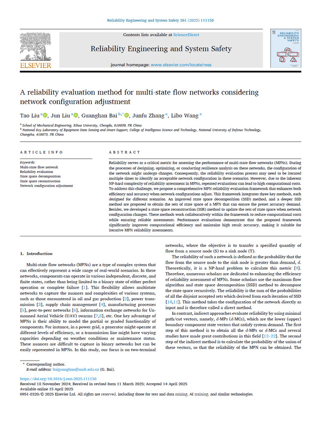 近日,機械工程學院張均富教授研究團隊在《Reliability Engineering and System Safety》(中科院SCI一區,影響因子9.4) 發表題為“A reliability evaluation method for multi-state flow networks considering network configuration adjustment”的研究論文。團隊劉濤老師為論文第一作者,2024級碩士研究生劉俊為論文的第二作者,國防科技大學白光晗副研究員為通訊作者,西華大學為論文第一完成單位。