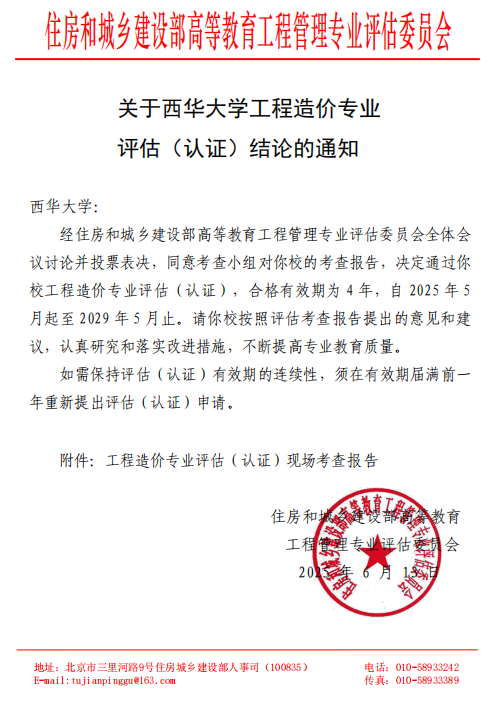 《關于西華大學工程造價專業評估(認證)結論的通知》