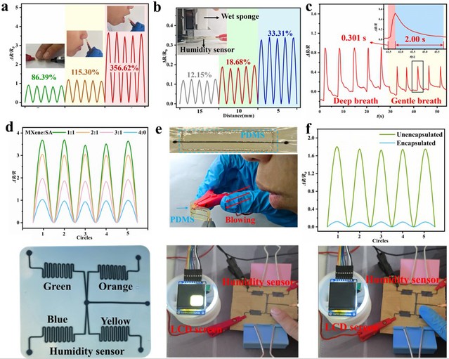 最終制備的MXene/SA@CS柔性傳感器展現(xiàn)出卓越的綜合性能:其溫度靈敏度系數(shù)(TCR)達(dá)1.08% ℃?1,較傳統(tǒng)MXene墨水基傳感器提升103%;在人體呼氣檢測中實(shí)現(xiàn)357%的電阻響應(yīng)幅值,伴隨0.30秒極速響應(yīng)時(shí)間和2.00秒恢復(fù)時(shí)間。尤為重要的是,基于CS基底的MXene/SA復(fù)合結(jié)構(gòu)不僅表現(xiàn)出優(yōu)異的生物相容性,更通過原位抗菌特性為可穿戴健康監(jiān)測設(shè)備構(gòu)筑了生物安全屏障。作為技術(shù)驗(yàn)證,研究團(tuán)隊(duì)開發(fā)了非接觸式濕度調(diào)控系統(tǒng),成功實(shí)現(xiàn)LCD顯示器的智能調(diào)制,充分展現(xiàn)了該傳感器在人機(jī)交互領(lǐng)域的革新應(yīng)用潛力。這項(xiàng)工作開創(chuàng)性地融合了氣溶膠噴射打印技術(shù)與界面工程策略,為構(gòu)建高性能、長壽命的柔性MXene基傳感器提供了全新范式,對先進(jìn)可穿戴電子設(shè)備的研發(fā)具有重要指導(dǎo)價(jià)值。