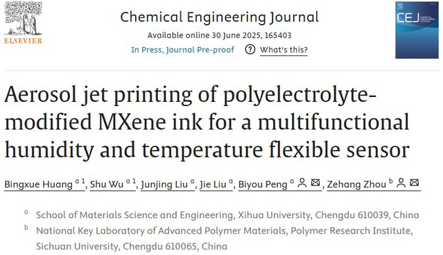 近日,材料科學(xué)與工程學(xué)院彭必友教授團(tuán)隊(duì)在材料科學(xué)與工程領(lǐng)域頂級期刊《Chemical Engineering Journal》(IF=13.2)發(fā)表題為“Aerosol jet printing of polyelectrolyte-modified MXene ink for a multifunctional humidity and temperature flexible sensor”的研究論文。彭必友教授與四川大學(xué)周澤航副研究員擔(dān)任本論文的共同通訊作者,西華大學(xué)材料科學(xué)與工程學(xué)院青年教師黃冰雪博士及2023級碩士研究生吳戍為該論文的共同一作,西華大學(xué)為第一完成單位,四川大學(xué)為第二完成單位。該項(xiàng)研究得到了北京化工大學(xué)有機(jī)-無機(jī)復(fù)合材料國家重點(diǎn)實(shí)驗(yàn)室開放基金、廣西碳酸鈣資源綜合利用重點(diǎn)實(shí)驗(yàn)室開放項(xiàng)目的資助。
