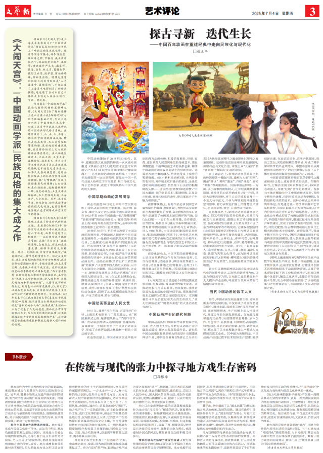 7月4日,我校美術(shù)與設(shè)計(jì)學(xué)院屈立豐教授學(xué)術(shù)文章《探古尋新迭代生長——中國百年動(dòng)畫在重述經(jīng)典中走向民族化與現(xiàn)代化》在《文藝報(bào)》“藝術(shù)評論”版發(fā)表。文章內(nèi)容如下: