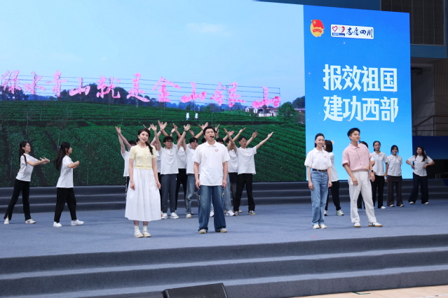 隨后,志愿者們唱響四川西部計劃主題曲《向西》。歌曲旋律激昂又飽含溫情,生動再現了志愿者們告別親友、奔赴西部的堅定身影,展現了扎根基層、服務群眾的熱忱與擔當,傳遞出一代代志愿者接力奉獻的青春傳承。在激昂的氛圍中,全體志愿者莊嚴宣誓,發出了“為中國式現代化挺膺擔當”的時代強音,展現出投身西部、服務基層的堅定決心。
