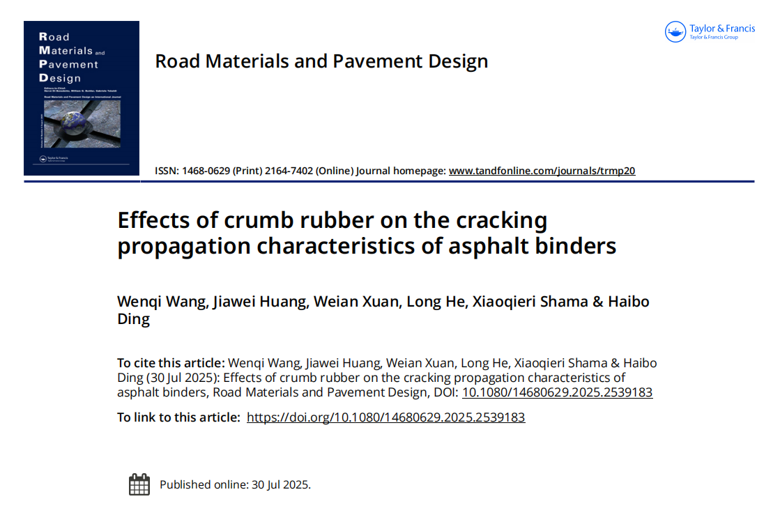 近日,建筑與土木工程學院王文奇副教授在路面材料領域國際期刊《Road Materials and Pavement Design》(JCR 2區,中科院3區)發表題為“Effects of crumb rubber on the cracking propagation characteristics of asphalt binders”的研究論文。王文奇副教授為論文第一作者,其2023屆碩士研究生黃嘉偉為論文第二作者,論文以西華大學為第一單位和通訊單位。