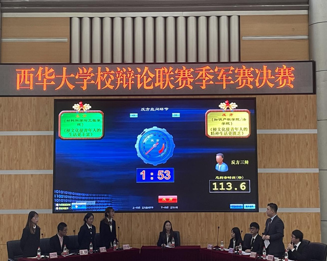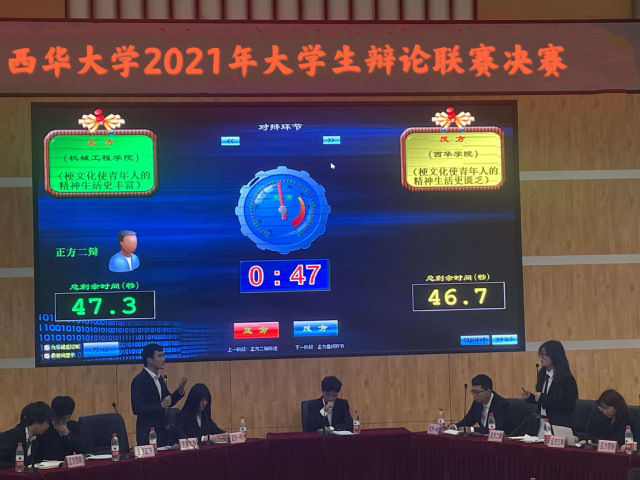 本次辯論聯(lián)賽于2021年4月上旬開賽,分為初賽、半決賽、決賽三個(gè)階段,吸引了全校17支代表隊(duì)參加。經(jīng)過兩個(gè)月的激烈角逐,知識(shí)產(chǎn)權(quán)學(xué)院、法學(xué)院與材料科學(xué)與工程學(xué)院爭(zhēng)奪季軍,西華學(xué)院與機(jī)械工程學(xué)院爭(zhēng)奪冠軍。本次決賽的辯題是“梗文化使年輕人的生活更豐富還是更匱乏”,雙方選手在立論、駁立論、智辯等各個(gè)環(huán)節(jié)中思路清晰,引經(jīng)據(jù)典,字字珠璣。在自由辯論環(huán)節(jié)中,雙方辯手圍繞論點(diǎn),唇槍舌劍,針鋒相對(duì),敏銳的思維、嚴(yán)密的邏輯、穩(wěn)健的臺(tái)風(fēng)不時(shí)贏得現(xiàn)場(chǎng)陣陣掌聲。