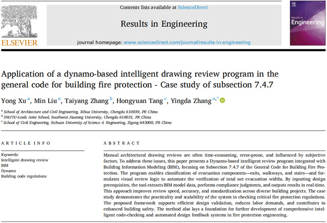 近日,建筑與土木工程學院徐詠博士團隊在國際知名期刊《Results in Engineering》(影響因子7.9,位于工程領域前3%,中科院分區2區)發表題為“Application of a dynamo-based intelligent drawing review program in the general code for building fire protection - Case study of subsection 7.4.7”的研究論文。建筑與土木工程學院張英達副教授為通訊作者,徐詠博士及2023級碩士研究生劉敏為該論文的共同第一作者,西華大學為第一完成單位。