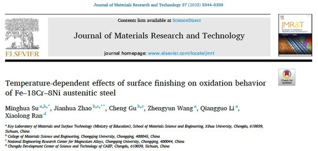 近日,材料科學(xué)與工程學(xué)院王正云教授團(tuán)隊(duì)蘇明華博士、李強(qiáng)國副研究員在《Journal of Materials Research and Technology》(IF=6.6)分別發(fā)表題為“Temperature-dependent effects of surface finishing on oxidation behavior of Fe-18Cr-8Ni austenitic steel”和“Improving the high stress abrasive wear resistance of medium carbon quenched and partitioned bainitic steel by controlling the phase transformation sequence”的研究論文。西華大學(xué)為第一完成單位,王正云教授為共同通訊作者。