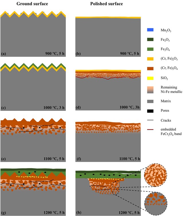 Fe-18Cr-8Ni奧氏體鋼因其價(jià)格低廉、制造工藝成熟以及優(yōu)異的機(jī)械性能,尤其是高溫下良好的抗氧化性,廣泛應(yīng)用于能源、核電等領(lǐng)域,但傳統(tǒng)安全服役溫度上限約為900°C,超1000°C后氧化性能下降。研究團(tuán)隊(duì)聚焦“表面研磨”這一低成本表面處理工藝,開展了研磨與拋光試樣在N2-21vol% O2氣氛,900-1200 °C溫度下的短期高溫氧化實(shí)驗(yàn)。結(jié)果表明,表面研磨對氧化性能的影響呈現(xiàn)顯著的溫度依賴性:在900°C時(shí),表面研磨加速了Cr的向外擴(kuò)散,有利于富Cr氧化層的更快形成,研磨試樣的抗氧化性優(yōu)于拋光試樣。當(dāng)氧化溫度≥1000 ℃時(shí),隨著表面粗糙度的增加,富Fe氧化層更快形成,內(nèi)部氧化加劇,拋光試樣的抗氧化性優(yōu)于研磨試樣。這項(xiàng)工作對于不同高溫服役場景下鋼材表面處理方案的選擇具有重要的理論指導(dǎo)意義。