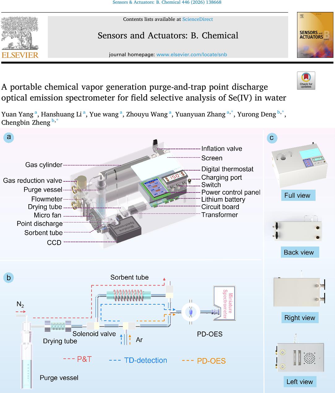 論文“A portable chemical vapor generation purge-and-trap point discharge optical emission spectrometer for field selective analysis of Se(IV) in water”第一作者為楊媛,通訊作者為西華大學張園園教授、四川大學鄧羽蓉博士和鄭成斌教授,西華大學為第一通訊單位。