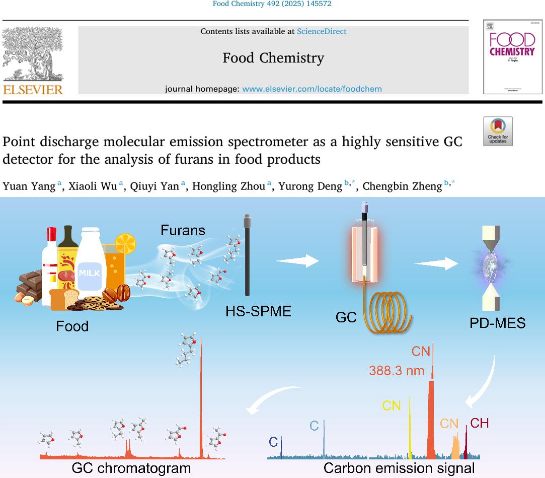 近日,理學院楊媛老師在農林科學領域國際頂尖期刊《Food Chemistry》(IF:9.8)發表題為“Point discharge molecular emission spectrometer as a highly sensitive GC detector for the analysis of furans in food products”的研究論文。在化學一區Top學術期刊《Chinese Chemical Letters》(IF:8.9)發表題為“High-throughput miniaturized purge-and-trap device integrating semiconductor refrigeration storage for on-site extraction and long-term preservation of VOCs in water”的研究論文。在化學一區Top學術期刊《Sensors and Actuators: B. Chemical》(IF:7.7)發表題為“A portable chemical vapor generation purge-and-trap point discharge optical emission spectrometer for field selective analysis of Se(IV) in water”的研究論文。