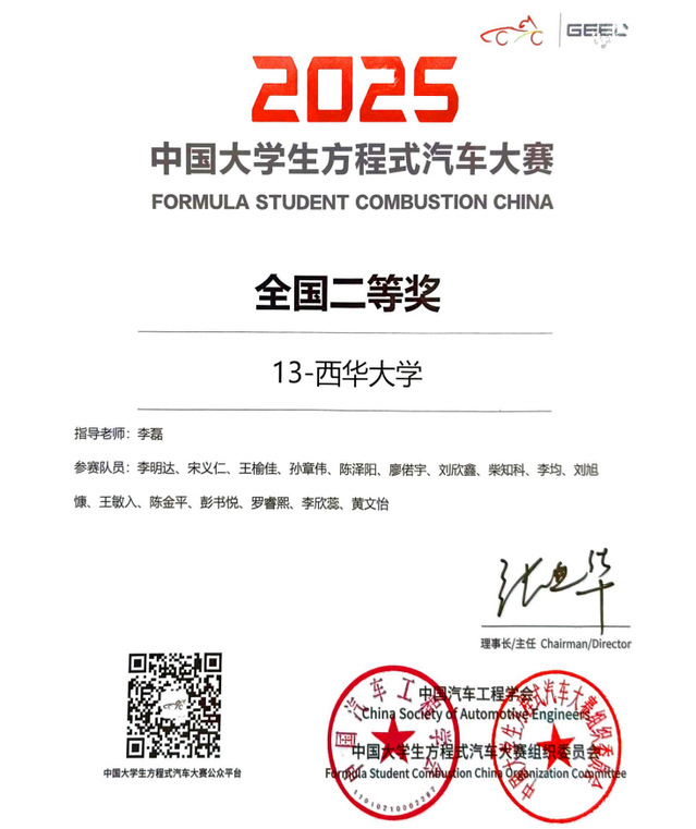 10月12日,2025“吉利杯”中國大學生方程式汽車大賽在鄭州圓滿落幕。西華大學大學生燃油方程式車隊憑借扎實的技術功底與出色的現場發揮,最終斬獲全國二等獎,并在多個賽項中表現優異,展現出卓越的工程實踐與臨場應變能力。